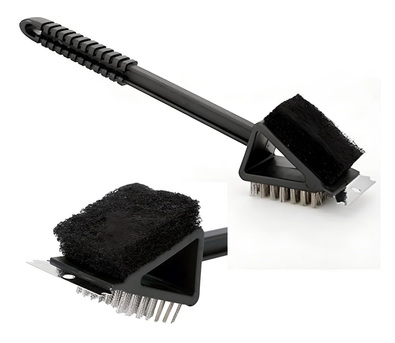 Long handle to reach the hardest parts of the grill easy without burns. Hard wire bristles to scrub any dirt from the grill, scrub pad to remove any rust, and scraper. Approximately 25cm.